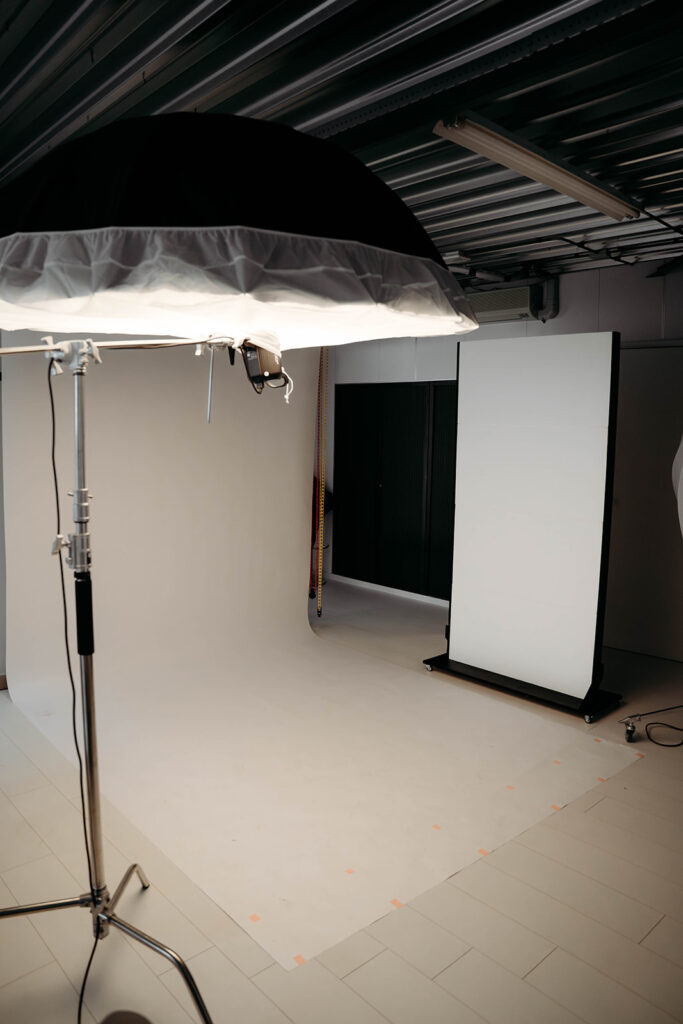 Er is een vast achtergrondsysteem van 2,5 x 2,5 meter beschikbaar, met zwarte, witte en groene achtergronden. Daarnaast zijn er professionele verlichting en flitsopties aanwezig.